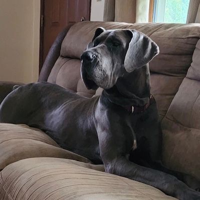 Cheyenne is very affectionate 3 year old Great Dane. She wants to be with her people. She will be attached to her person or people at the hip. She loves to play and is 100% potty trained. She is still adjusting to being in a crate when no one is home. She is nervous when left unattended and can get in trouble if left to her own devices. She wants to sleep next to you on the couch or in bed. She requires a 6 foot privacy fence. She has jumped shorter fences. She is nervous around new people when alone and motions like putting on a back pack or a coat. Cheyenne is dog and cat friendly.